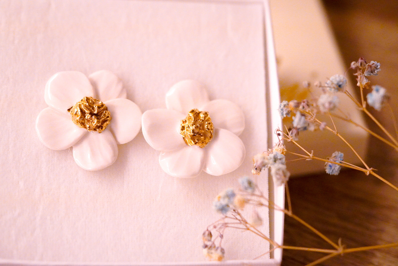 Verwendete Materialien: - weißer deutscher Ton / farbige bleifreie Glasur / 24 ct Gold I Alle verwendeten Farben und Glasuren sind bleifrei. Chirugische Stahlstecker. Ideal für Menschen, die anfällig für Schmuckallergien sind.