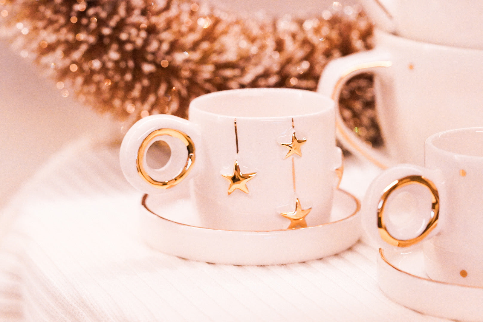 • Materials Used: The cups are made from white clay sourced from Sakarya, Turkey, in the region of JALOS Atelier. They are hand-painted and finished with a transparent lead-free paint and glaze, as well as genuine gold.